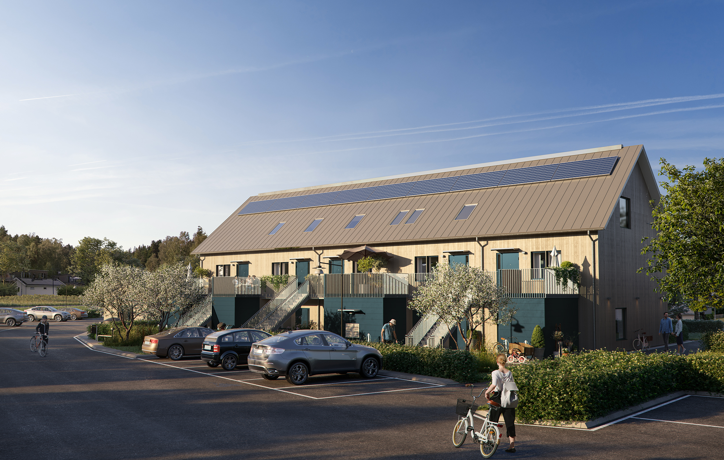Solceller installeras på taken för att bidra till hållbar energiproduktion. Byggnationen påbörjas våren 2025 och inflyttning planeras ske sommaren 2026.